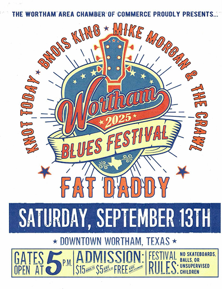 The Wortham Area Chamber of Commerce proudly presents Wortham Blues Festival 2025, to be held on Saturday, September 13 in downtown Wortham.