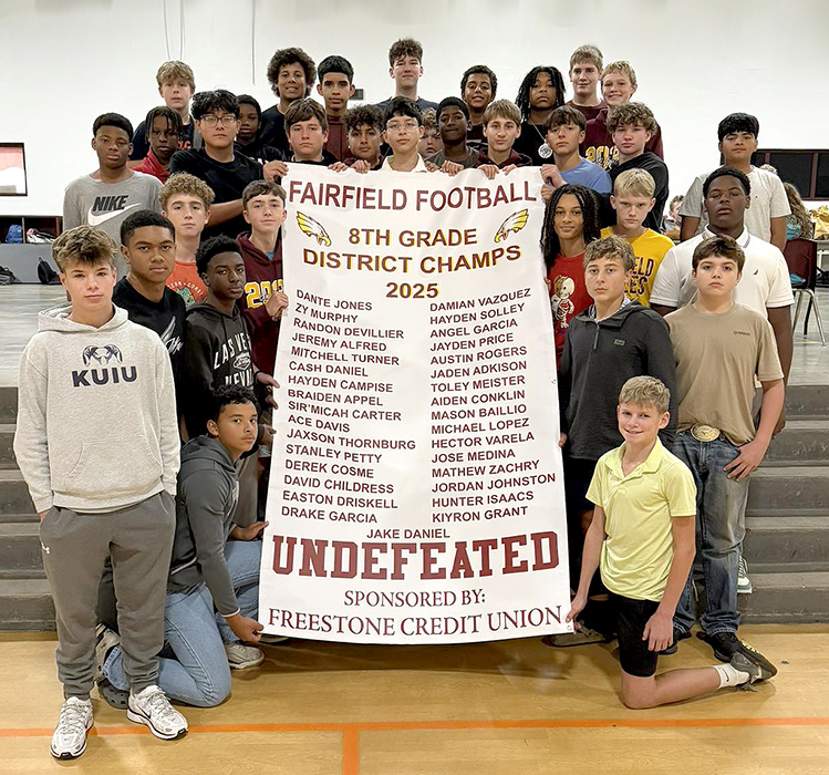 EARNING THE TITLE of Undefeated District Champs 2025 is Fairfield Junior High’s 8th Grade Football Team. Congratulations to the players: Dante Jones, Zy Murphy, Randon DeVillier, Jeremy Alfred, Mitchell Turner, Cash Daniel, Hayden Campise, Braiden Appel, Sir’Micah Carter, Ace Davis, Jaxson Thornburg, Stanley Petty, Derek Cosme, David Childress, Easton Driskell, Drake Garcia, Jake Daniel, Damian Vazquez, Hayden Solley, Angel Garcia, Jayden Price, Austi Rogers, Jaden Adkison, Toley Meister, Aiden Conklin, Mason Baillio, Michael Lopez, Hector Varela, Jose Mdina, Mathew Zachry, Jordan Johnston, Hunter Isaacs, and Kiyron Grant. The banner is sponsored by Freestone Credit Union. Congratulations to these young athletes. (Courtesy Photo)