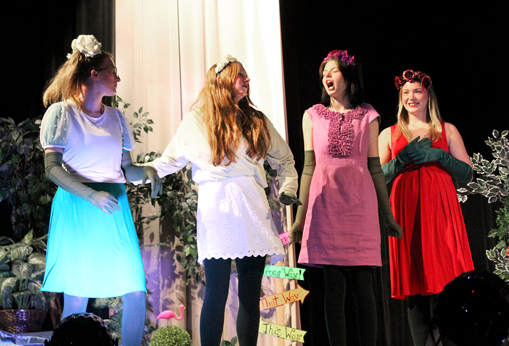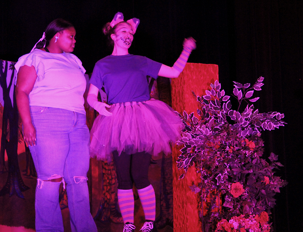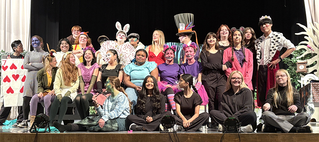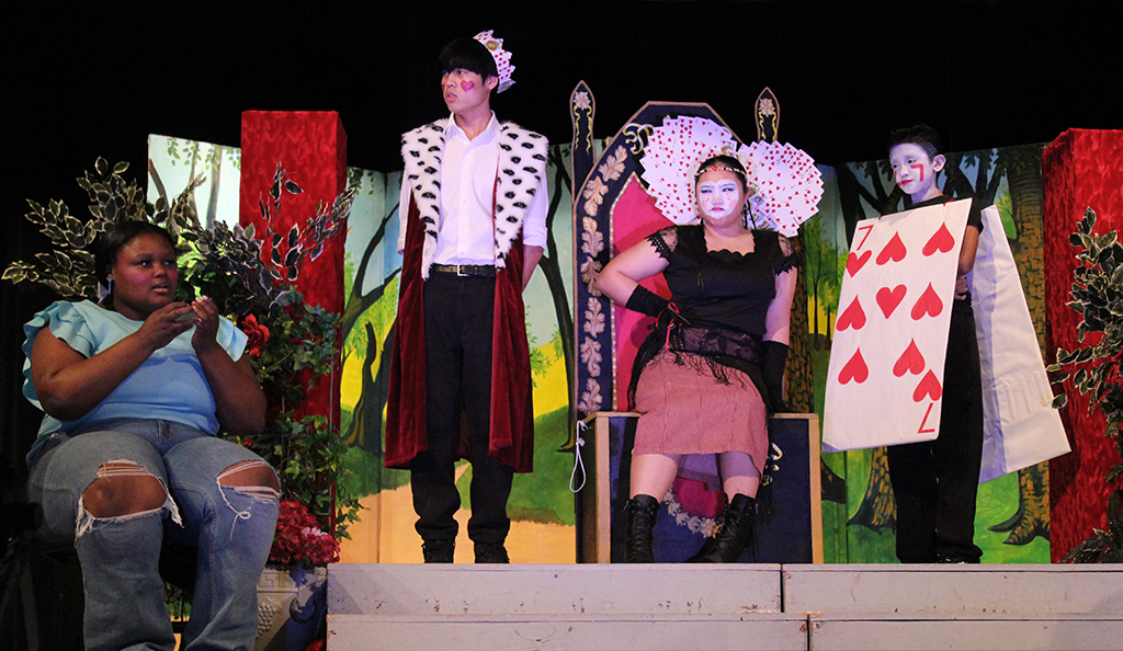 Cast consisted of freshman Nevaeh Brackens as Alice, sophomore Solomon Growden as White Rabbit, freshman Aaliyah Tran as Queen of Hearts, junior Skylar Cook as Caterpillar, sophomore Jonathon Escandon as Frog-Newsie, sophomore Jonathan Ramirez as Fish-Newsie, junior Bella Falkner and junior Adalyn Peterson as Cheshire Cat, freshman Owen Lane as Mad Hatter, sophomore Anna Allen as March Hare, Jazlynn Varela as Dormouse, freshman Devin Bonner as Tweedle-Dee, junior Daniel Bonner as Tweedle-Dum, Dania Azuara as Humpty-Dumpy, and Kimmykay Rath as King of Hearts.