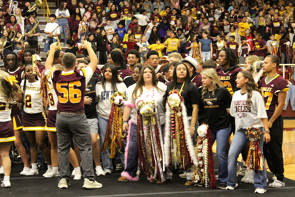 FAIRFIELD EAGLE HOMECOMING COURT 2025 (at top) includes (left to right): Rhett Ralstin – Senior Nominee, Blayke Brackens – Senior Nominee, Lauren Scott – Junior Class Duchess, Adisyn DeVillier – Sophomore Class Duchess, Sonya Gibson – FHS Principal, Kaylee Williams – Senior Nominee, Samayah Wiley – Senior Nominee, and Micah Thurman – Freshman Class Duchess.
