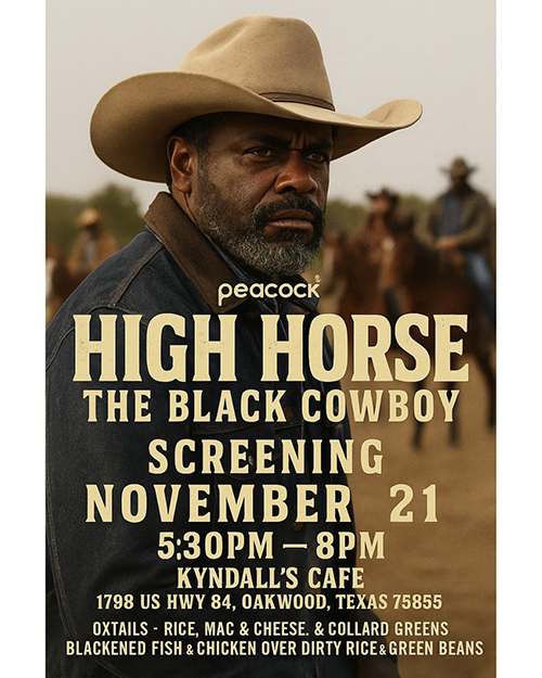 Join them Friday night, November 21, 2025, at Kyndall’s Café in Oakwood for an exclusive screening as they celebrate this incredible moment for Texas and for Black cowboy culture, a story of legacy, grit, and pride.