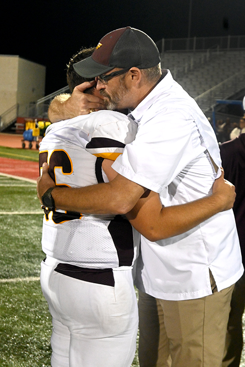 Coach Timothy Judkins gives senior Mason Edwards a hug after Fairfield fell to Yoakum 36-29 in the Area Championship on Friday night at Belton High School.