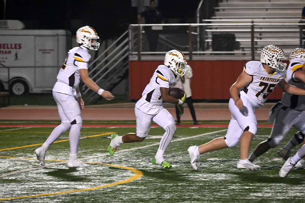 The final gasp of the half was almost a miracle when a pass was completed to Cayson Gamez, and he broke a tackle, but Collins came from the safety position to knock him down at the Fairfield two-yard line. The 52-yard play started with ten seconds on the clock and the time expired when Collins made the tackle, preserving the 22-21 Eagle lead.