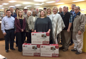 Fairfield Rotary Club presents Fairfield Public Library with three Chromebase computers to help with the ongoing improvements planned for the library. Fairfield Rotary Club received a matching funds grant through a Rotary district assistance program (DAP) to help with this project. Pictured are (l-r): Gary Wiggins – Librarian, David Huffman – Rotarian, Gena Robinson – library board member, Tammy Gawryszewski – library board member, Ralph Billings – library board member, Carol Bradley – library board member, Angela Oglesbee – Rotarian, Christine Manning – library board member, Landis Bayless- Rotarian, Cristina Allred – library board member, Josh Bayless – Rotarian, Glenda Brooks – Rotarian, Donna Tyus – Rotarian, Lyle Red – library board member, Lynn Simpson – Rotarian, Jason Hullum – Rotarian, Gene Chavers – Rotarian.