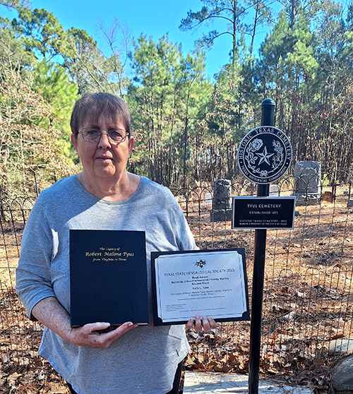 Kelly Tyus of Fairfield recently received the certificate and monetary award from Texas State Genealogical Society. Ms. Tyus entered and won second place in the 2025 TxSGS contest category “Books by a Non-Professional / Family History” for her family history book titled “The Legacy of Robert Malone Tyus: Sussex County, Virginia to Freestone County, Texas.