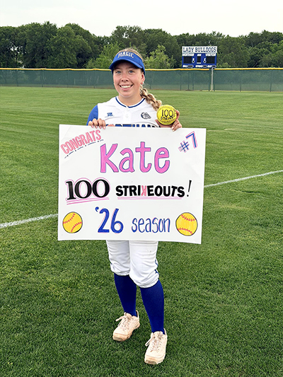 HITTING A MAJOR MILESTONE, 100 strikeouts during the 2026 softball season, is Wortham Lady Dawgs pitcher, Katelynn (Kate) Spain, #7.